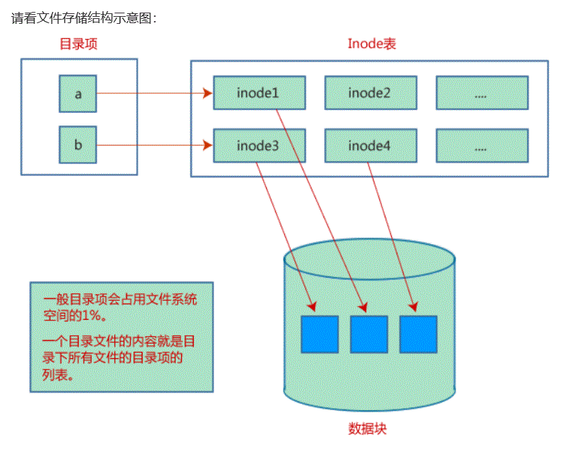 当查看某个文件时,会先从inode表中查出文件属性及数据存放点,再从数据块中读取数据。